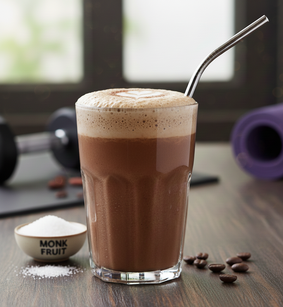 For coffee + chocolate lovers. All the mocha café vibe, but with whey protein, monk fruit, and cold milk instead of sugar syrups.