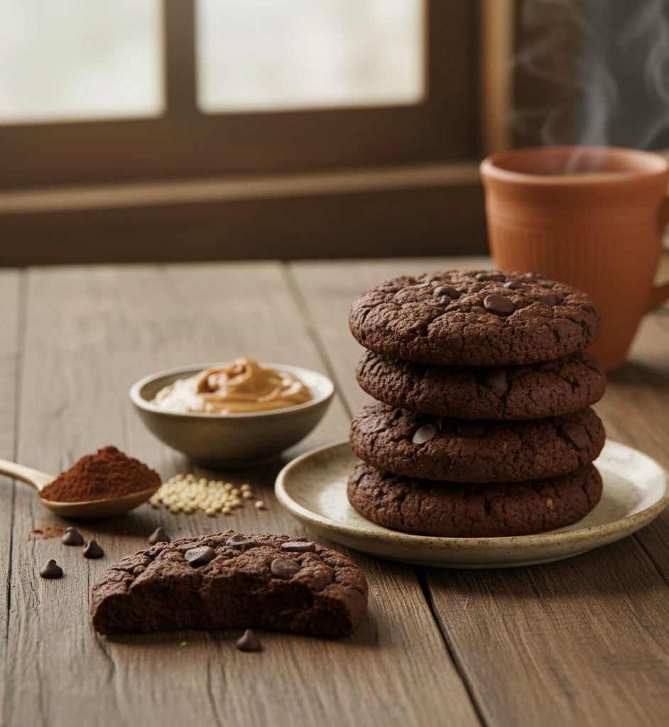 Chocolatey, millets-based cookies with jowar, ragi, oats, peanut butter, and cocoa. High in fibre, no maida, and sweetened without refined sugar.